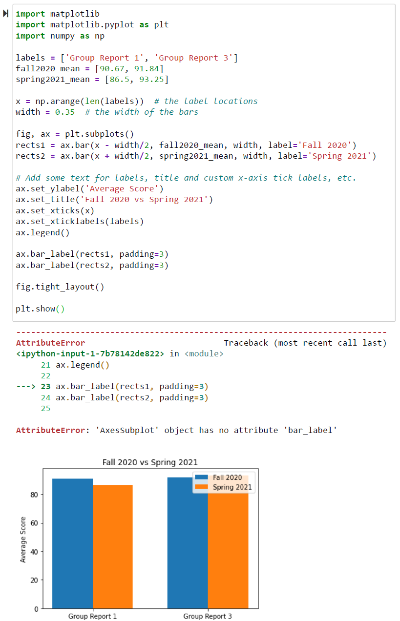 AttributeErrorAxesSubplotobject has no attributebar_label Tensorflow installation and uninstall Anaconda version Attributeerror. AxesSubplot object has no attribute bar_label 解决方法 是由于matplotlib版本过低导致的需要重装matplotlib在控制台中输入以下指令 ① 卸载matplotlib conda uninstall matplotlib ②重新下载 pip install matplotlib.